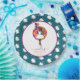 Este diseño presenta a una hermosa mujer negra con un vestido blanco y zapatos sobre un fondo azul turquesa y naranja con flores rosadas, sosteniendo 3 globos.