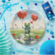 Una alegre rana animada se levanta sobre una roca sosteniendo tres globos rojos en forma de corazón. La escena se encuentra en un exuberante campo salpicado de tulipanes rojos, y un cielo azul con nubes esponjosas cuelga por encima.