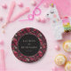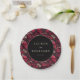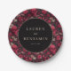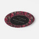 This wedding plate features a bold and romantic design with a central black circle framed by a repeating pattern of red skulls and floral motifs on a dark background. The color palette includes deep reds, muted pinks, and off-whites, creating an edgy yet elegant aesthetic. The gothic theme is balanced with romantic florals, making it perfect for couples who appreciate a dramatic touch in their celebration. Customizable text allows you to personalize the design with names and dates, adding a unique touch to your special day.