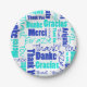 Las placas de papel presentan una nube de palabras con azul medio y turquesa "Gracias" escrito en varios idiomas y una variedad de tipos de letra sobre blanco. Haga clic en "Personalizar" para seleccionar un color de fondo distinto del blanco.