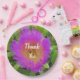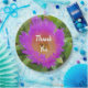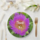 Llame a sus empleados o clientes juntos para una celebración de apreciación. Personalice su comida, bufé o hora de cóctel con estos platos de papel con una gran flor de playa violeta. La foto floral muestra pétalos de flores moradas largos con un centro amarillo claro. La flor está rodeada de hojas verdes claras. "Gracias" aparece en el centro con una fuente blanca que se puede personalizar fácilmente si se desea.