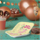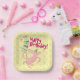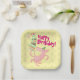 Un cerdo feliz en placas de papel de cumpleaños. Utilice "Personalice esta plantilla" para modificar el texto de "¡Feliz Cumpleaños!" y crear un mensaje único y personalizado. Accesorios de fiesta con un lechoso cerdo, debajo de una tarta de capa hirviendo con azotes de hielo verde y coronados con velas rosas.