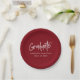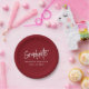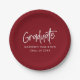 Añade un toque especial a tu fiesta de graduación con platos de papel de graduación personalizados. Las placas de papel muestran "Graduado" en un guión escrito a mano en blanco con un fondo burdeos o color de su elección. Personalice las placas de graduación burdeos añadiendo el nombre y el año de graduación.