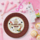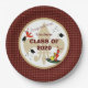 Condimente para arriba a su fiesta de graduación de Cajun con estas placas de papel personalizadas que ofrecen un cangrejo que lanza un gorra de la graduación y un cangrejo en una piragua que juega el saxofón en fondo de la flor de lis en un rojo del marrón de la diversión y un diseño del oro.
