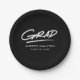 Platos modernos de papel de graduación con "Grad" mostrados en letras blancas escritas a mano con un subrayado discontinuo sobre un fondo negro. Personalice las matrículas en blanco y negro con el nombre y el año de graduación. ¡Las placas personalizadas de papel para la graduación son perfectas tanto para fiestas de bachillerato como universitarios!