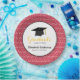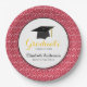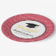 Esta placa de papel de graduación (desechable) presenta un gráfico de un gorra de graduación (mortarboard) y texto de personalizable para: Clase de, Nombre de los Graduados, Nombre de la Escuela. Este plato de papel se acentúa con un patrón giratorio blanco sobre un fondo rojo. La palabra "graduado" es amarilla.