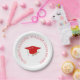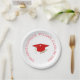 Platos de papel de colores escolares rojos y blancos bonitos para su celebración de graduación. Gorra roja/ birrete con una borla blanca y diploma con cinta roja. El color de fondo se puede cambiar a cualquier color que desee. Cambie el nombre al suyo, agregue su año de graduación.
