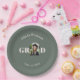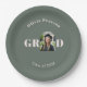 Add a custom touch to your graduation party table settings with these personalized paper plates. In stylish sage green with contrasting blush pink typography, the plates feature a portrait photo of your graduate in an elegant arch-shaped frame, within the word 'GRAD' in bold lettering across the center of the design. Above and bleow, the plates display your graduate's name and 'Class of' year. This elegant graduation party tableware makes a unique and meaningful detail for graduation celebrations. Ideal for high school graduation parties, college graduation celebrations, and graduation open house events.