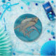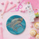 Un gran tiburón blanco en el agua muestra sus dientes. Este diseño parece realmente efectivo en estas placas de papel