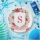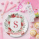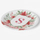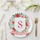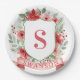 This Christmas paper plate design has a preppy grandmillennial design featuring a floral crest surrounded with berries with a monogram letter in the center.