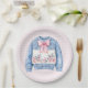 Este plato fiesta Navidad tiene un suéter de Navidades azules y rosas con un arco rosado.