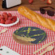 Plato De Papel Grapeador en hierba verde en fondo azul