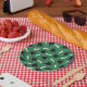 Graduation party paper plates printed with a green pattern of graduation caps and diplomas with a yellow ribbon.