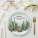 Placas de papel con bosques de pino y fogones. Todo está colocado sobre un fondo blanco y verde claro. Perfecto para su próxima reunión familiar, cumpleaños o cualquier evento con temática natural. Personaliza fácilmente todo el texto. - Kate Eden Art.