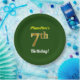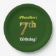Este sencillo, personalizado diseño de placas de papel con temática de cumpleaños incluye un mensaje de personalizable como "¡UnameAquí es el séptimo cumpleaños!", donde se puede cambiar el nombre, y con el "séptimo" con un aspecto falso/imitación dorado. También cuenta con un fondo de color verde. Las placas de papel como estas podrían ser usadas en un fiesta que se celebra el séptimo cumpleaños de alguien. [~Z0000145]