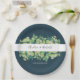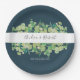Las hojas de eucalipto verde fresco enmarcan tus nombres en una tipografía elegante con tu fecha especial fijada en un texto clásico en este moderno plato de papel temático de boda rural. Diseñado por Thisisnotme©