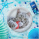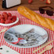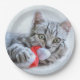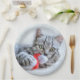 Placas de papel con una linda fotografía de Navidades de un gato gris manchado mordiendo juguetamente un sombrero rojo de santa. Sus grandes patas esponjosas hacen que esta foto sea extra deliciosa.