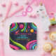 Invitación de cumpleaños vibrante y divertida con un diseño psicodélico de inspiración retro. El fondo oscuro está decorado con formas coloridas y agitadas, líneas abstractas y tonalidades de colores que recuerdan a los años 70. El borde es un patrón divertido de caras sonrientes multicolores, con estrellas y burbujas dispersas por todo el diseño. El texto es una mezcla de fuentes atrevidas y juguetonas, con detalles clave resaltados en azul brillante y rosa.