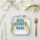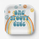 Groovy One Retro inspiró platos de primer cumpleaños con fuentes estilo 70 y colores arcoiris y signos de paz.