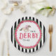 Este plato de fiesta de Derby tiene un caballo de carreras de acuarela con un jinete de rosa rodeado de una corona de rosas rojas con el dicho "Háblame de DERBY". Hay un fondo a rayas negras y blancas.