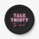 Talk THIRTY To Me 30th Birthday Fiesta Neon Pink Paper Fiesta Plates presenta un moderno texto de neón rosa "Talk Thirty to me!" en escritura moderna de caligrafía con un fondo negro. Diseñado por Evco Studio www.zazzle.com/store/evcostudio