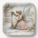 Un delicado hada adornada con acentos florales toca un arpa sobre el fondo de notas musicales
