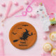 La silueta de una bruja malvada montando su escoba con su gato negro a través de una luna naranja te asustará y traerá una risa divertida. Personalice su plato agregando su nombre o cualquier texto que elija. Diviértete esta temporada de vacaciones.