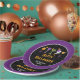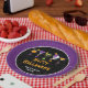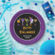 This fun and spooky paper plate features Halloween themed cocktails with decorations such as a witch's hat, broomstick and cauldron, ghost, bat, pumpkins and eyeballs. In the background is a black and purple damask pattern. The text combines decorative and serif fonts for a stylish and modern look. This is perfect for a Halloween fancy dress costume party.