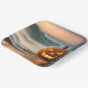 Jack-o-lantern de Halloween en la orilla del mar en surf oceánica con resplandor naranja.
