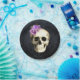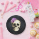 Sirva a sus fiestas en este plato gótico de papel de calavera floral con un cráneo blanco acentuado con hermosos rosas morados sobre un fondo de textura negra. Perfecto para su fiesta de Halloween o eventos de temática gótica.