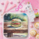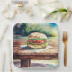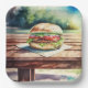 Hamburguesa en una mesa de picnic para que la gente pueda poner una hamburguesa en una mesa de picnic. Así que meta.