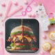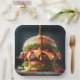 La imagen representa una gran hamburguesa de queso sobre un fondo negro. La hamburguesa se compone de varios ingredientes, entre ellos un bollo de semilla de sésamo, una gran parcela de carne, tocino, queso, tomates y lechuga. La hamburguesa es visualmente dinámica, con ketchup vertido sobre ella. El contraste entre los ingredientes coloridos de la hamburguesa y el fondo oscuro intensifica su atractivo visual.