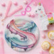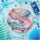 A dreamy watercolor painting of a curved waterslide rendered in soft pastel pink and powder blue hues that blend and flow together like cotton candy clouds. The slide winds gracefully through the composition with gentle curves and spirals, its translucent colors bleeding into each other with the characteristic wet-on-wet watercolor technique. Delicate splashes and droplets of water are suggested through lighter washes and negative space, creating a sense of movement and joy. The background fades into a pale, ethereal wash of complementary pastels, giving the entire scene a whimsical, childhood-memory quality with soft, diffused lighting.