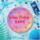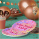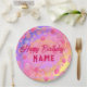 Platos de papel de cumpleaños rosado con el nombre de la persona y "¡Feliz cumpleaños!" El diseño tiene un efecto de color especial con varios puntos orbales que agregan profundidad, color y riqueza al contexto. Un bonito diseño que añade mucho encanto a la mesa. Los accesorios que se venden por separado incluyen tazas de papel y una placa de papel con tus fotos personales. HAMbyWhiteGlove alias HAMbyWG.