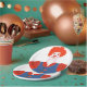 La pintura de un payaso alegre y sonriente con el pelo y la camisa rojos, y el puentador azul, está imprimiendo en placas de papel personalizado para celebraciones de cumpleaños.