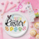 A Colorful Happy Easter Party Plates With A Cute Script Design Into A Rabbit With Eggs
