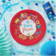 Happy Purim - Paper Plate. Translation from Hebrew: Happy Purim! Purim Jewish Holiday poster with stars of David, traditional Hamantaschen cookies, gragger toy - noisemaker, balloons, musicians, masks, Purim basket on festive confetti background. Wish a great Purim celebration. Carnival, Masquerade, Festival, Kids Party, Israel. Crafts & Party Supplies > Party Supplies > Tableware > Paper & Party Plates