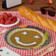 Whipped cream happy face on Thanksgiving pumpkin pie with autumn leaves and gourds on rustic barn wood