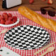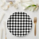 Conjunto de ocho placas de papel de 9" con una imagen de argyle blanco y negro, un diseño popular en los años 80. Vea el frasco de caramelo, taza de espresso, matraz, jarra, tetera y tiras acuáticas. Ver toda la colección de placas tubulares de los años 80 en la FOOD/BEV | Sección de platos.