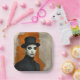 Designed for a gothic themed adult Halloween costume party, this distinctive party plate showcases a mysterious host in a cracked porcelain mask, crimson smile, and formal black attire. A bold abstract background of painted orange and beige - taupe muted paint adds a touch of artistic elegance. Plates are available in 2 sizes; shown here in the smaller 7-inch diameter size, they are also available in a 9-inch diameter size.