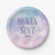 Placa de ducha para bebés de diseño y elegante con acuarelas de color rosa y violeta con nubes y estrellas. El texto dice "enviado por el cielo".