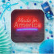 Un cartel de neón resplandece con las palabras "Hecho en América" en rojo y azul en negrita contra una pared de ladrillo