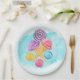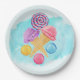 Un diseño de placas de papel fresco con 2 helados con helados rosados y morados. Una piruleta con un centro de espiral. Y algunos caramelos coloridos. Está situado sobre una mancha de pintura azul turquesa.