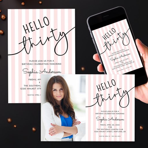 Hello Thirty Modern Script Chic Stripes BirthdayDiseñado por Linda Terwee