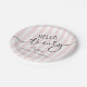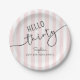 This 30th birthday party paper plate showcases modern script typography reading “Hello Thirty,” complemented by a soft pink and white striped background. It's simple yet stylish design makes it a perfect addition to her celebration party.
