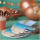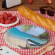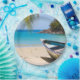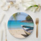 Placa de papel con una idílica escena tropical en la playa. Agua azul turquesa cristalina y una playa de arena fina de color marrón. Algunas hojas de palmera cuelgan desde arriba. En la playa hay una vieja barca de madera. Un paisaje tranquilo y sereno.