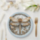 Preciosa baldosa Art Deco libélula, platos de papel con alas de vidrio, perlas bonitas, flores de esmalte blanco y filigrana de hoja de oro. Fondo azul claro que se puede cambiar a su gusto.