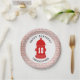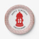 Platos de fiesta de cumpleaños con un ilustracion de una boca de incendios roja y un borde de ladrillo. Personalice el texto. En el Jill's Paperie encontrará servilletas, invitaciones y más que coincidan.