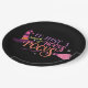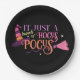 Cute Diversión Pastel Brujas Hocus Pocus Halloween Gorra Broomstick Plates de papel, bienvenidos a sus invitados con este lindo y espeluznante y divertido felíz doormat de Halloween personalizado. El elegante diseño de la tipografía muestra "Es sólo un montón de Hocus Pocus" frases amarillas, púrpura y rosa pastel, naranjas, broomstick de brujas y de inicio, gorra de brujas, de fondo negro.