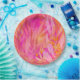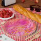 Las hojas de colores vivos y los elementos botánicos se solapan en tonos rosados, naranjas y amarillos con un fondo vibrante. La composición crea un ambiente cálido, alegre y enérgico.